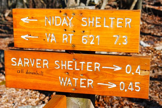 We reached the sign for the Sarver Hollow shelter and decided to pass since it was 0.4 off of the trail (and somebody has written “all downhill” on the sign).