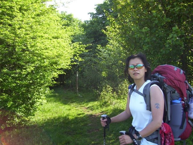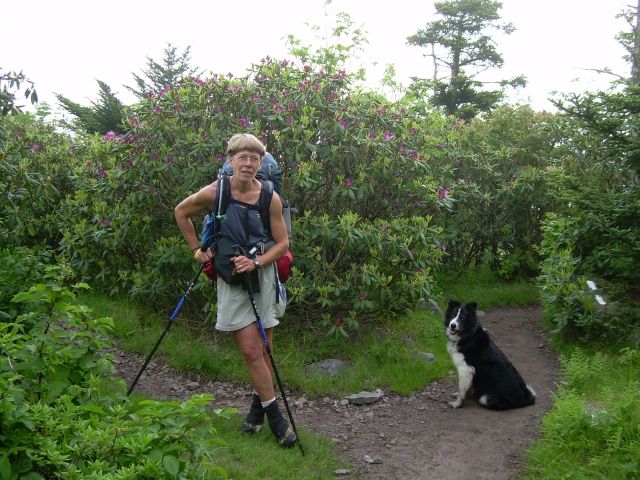 After lunch we continued climbing to the summit of Mt. Rogers. Unfortunately, there was no tree cover and the heat and the humidity made the hiking tough. At the trail head to the summit, we met the Train Gang (3 NOBOs). The Gang consisted of Momma Train, Bag of Beans, and the Sheriff (dog carrying his own food and bedroll). The trail to the summit is not part of the AT and there is absolutely no view from the summit! But, we all ditched our packs and hiked to the summit so we could brag that we had been to the highest point in Virginia.