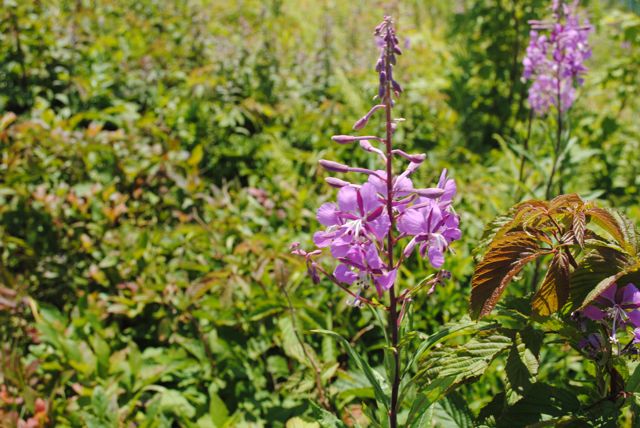 We descended into the Scales and were again exposed to the sun. The Scales has a nice fenced camping area with a privy and an area for horses. We saw pretty purple flowers that Sharon thought were floux.