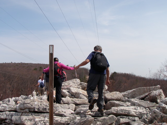 Trail Doc and hikerBG have recently become infected with White blaze fever! They embarked on a backpacking trip on Friday and started at the State Game land parking lot south of Hawk Mountain road. They pitched their tent about 4 miles south of Bake Oven Knob. They woke up early on Saturday and hiked to the Bake Oven Knob parking lot to meet the group. They stashed their heavy packs in someone’s car and used their day packs for the group hike.