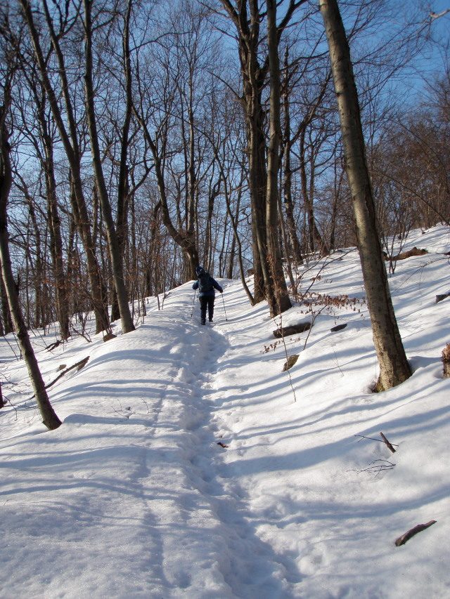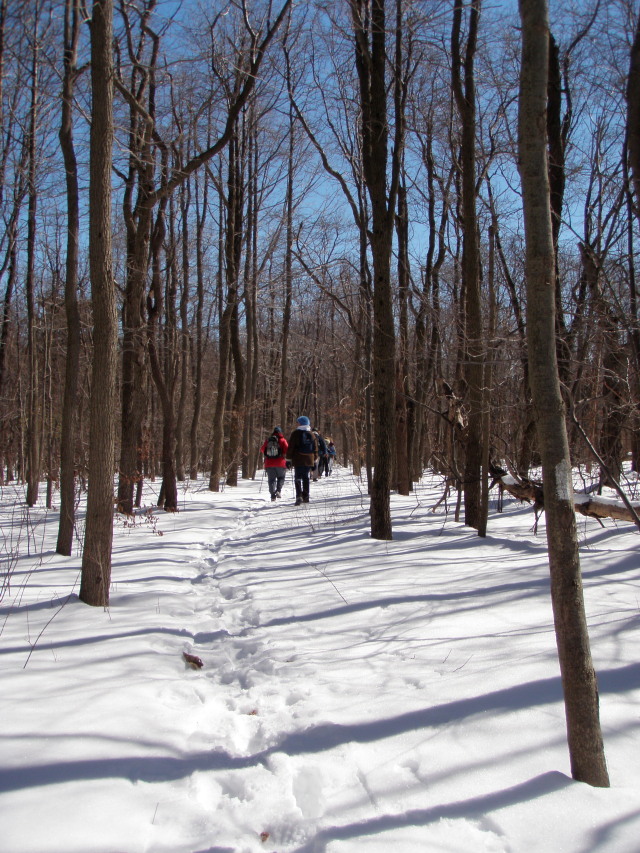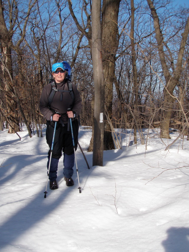 A total of ten hikers started on the trail just before 10:30 AM with Janet in the lead and the co-leader Dirigo as the sweep. It was a beautiful sunny day with very little wind. The trail was covered in snow but previous hikers had broken down the snow for us. In some cases it was easier to walk outside the broken snow because we did not slide in the slushy snow.