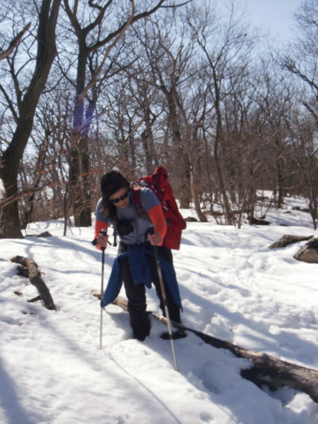 At one point we both were so hot Dirigo said that she wished she had zip off pants cause they both decided it would be great hiking in shorts and snow. Dirigo started to unzip her winter hiking pants as they have zippers in the back, but it exposes her butt. As she was doing this, 3 young men with backpacks started towards us. Ok, no bare butt hiking today!