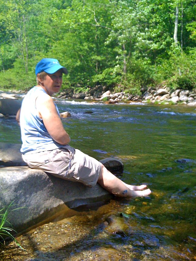 We were so happy to reach the parking lot. The sign said that we had hiked 6.2 miles from the Crab Tree Falls Trail – we thought it was 5.??. WTF??? We put our packs in Knitting Bull’s car and crossed the road to the Tye River. We all soaked our feet and enjoyed a piece of Knitting Bull’s molasses cake. We were beat up but felt great!