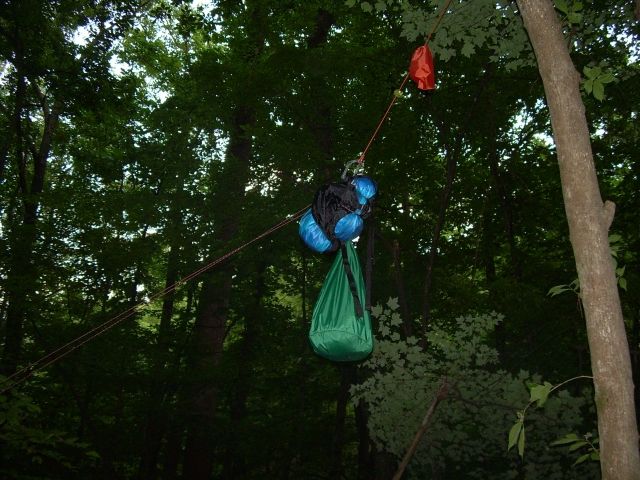 As soon as Sling Blade saw the throw bag, she asked if all of our food food would fit into that little bag. Python was able to launch the throw bag over the branch on the first attempt and we pulled all the food bags up the line.