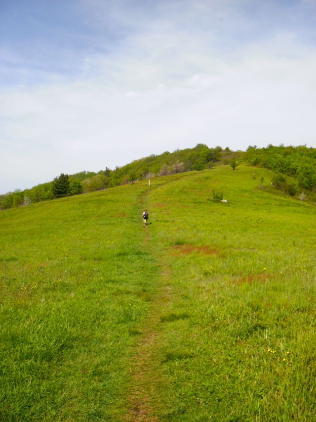 We passed thru a fence and a blocked gate and began to climb again. We came to a small open field with a sign about not camping in the area. It was very hot so we hiked faster to stay out of the sun. We went into the woods again, but came out into a very large open area, which I believe was an open field across Cold Mountain. The views were open and we followed the white blazes on posts in the field. We began the ascent to the summit of Cold Mountain and and then descended into Cow Camp Gap.